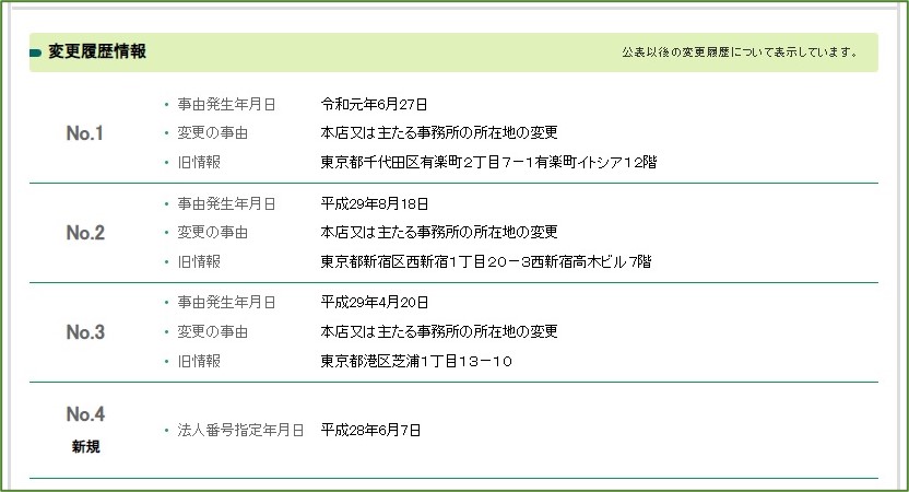 しかし法人番号公表サイトには下記のような情報も掲載されています。これは弊社の事例ですが、「本店または主たる事務所の所在地」などの変更履歴情報が、法人番号公表サイトには掲載されています。
