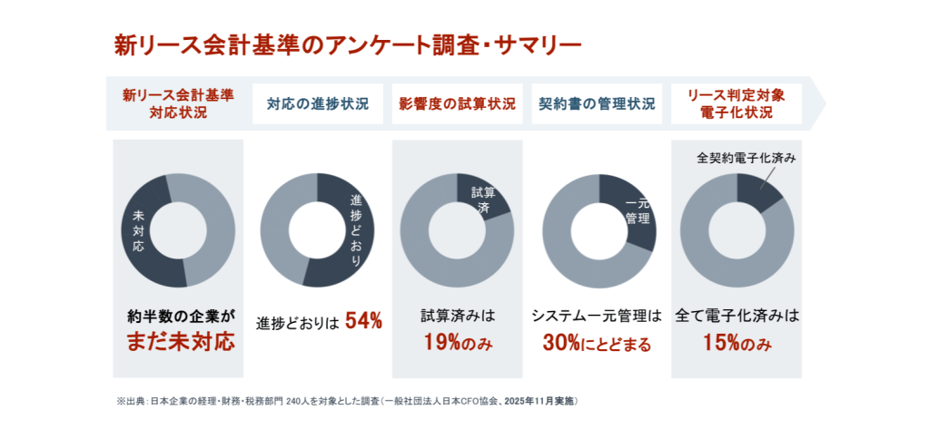 2025年11月にファーストアカウンティングとCFO協会と新リース会計基準対応の進捗度の調査を行いました。アンケート回答の約半数ではまだ未着手、未対応という結果でした。