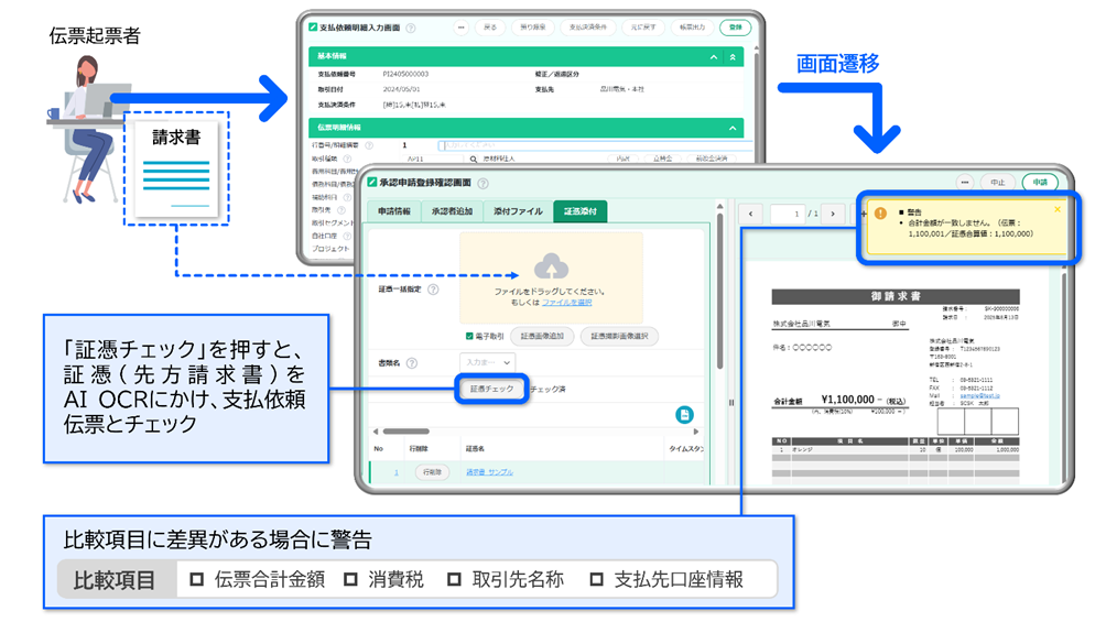 本連携により、これまで経理担当者が目視で行っていた「請求書PDFと支払依頼データ」の照合(突合)作業をAIが自動化することで入力ミスや出金トラブルを防止し、ガバナンス強化と業務効率化を同時に実現します。